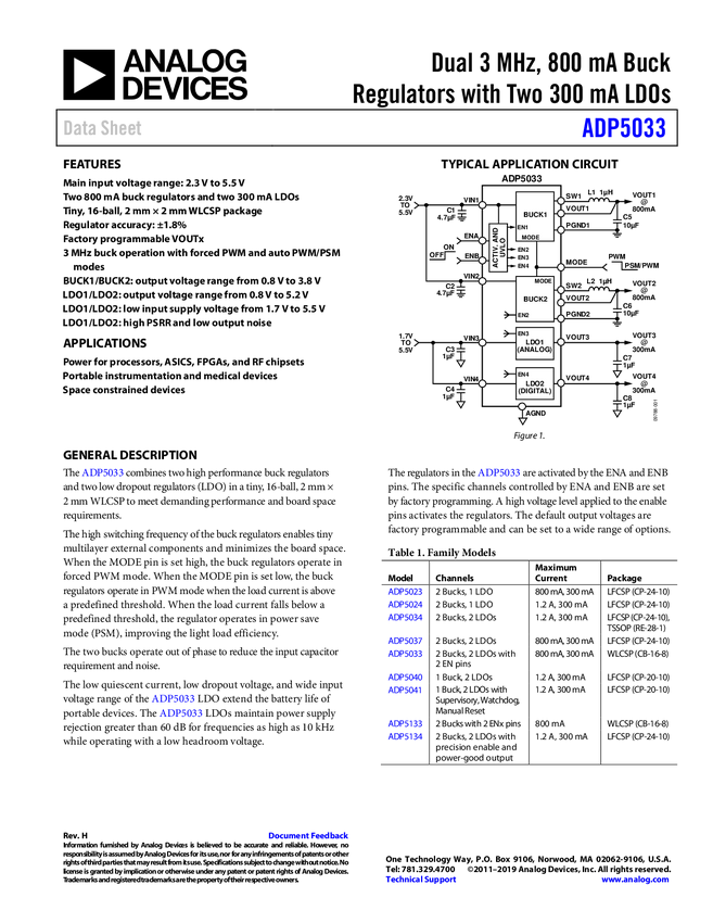 ADP5033 Dual 3 MHz, 800 mA Buck Regulators with Two 300 mA LDOs