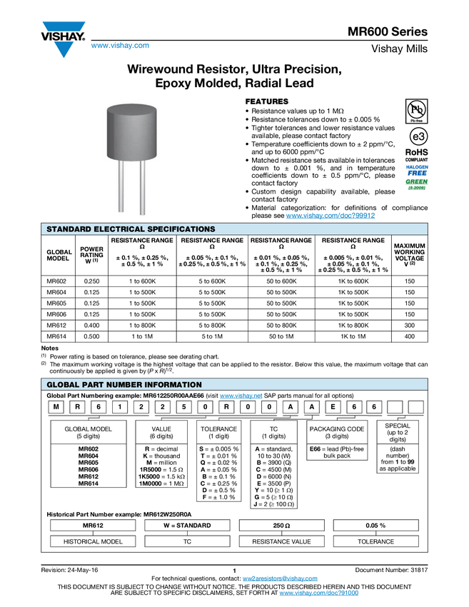 MR600 Series Wirewound Resistor, Ultra Precision, Epoxy Molded, Radial Lead