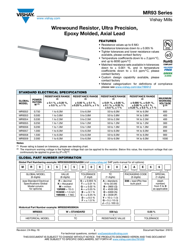 MR93 Series Wirewound Resistor, Ultra Precision, Epoxy Molded, Axial Lead