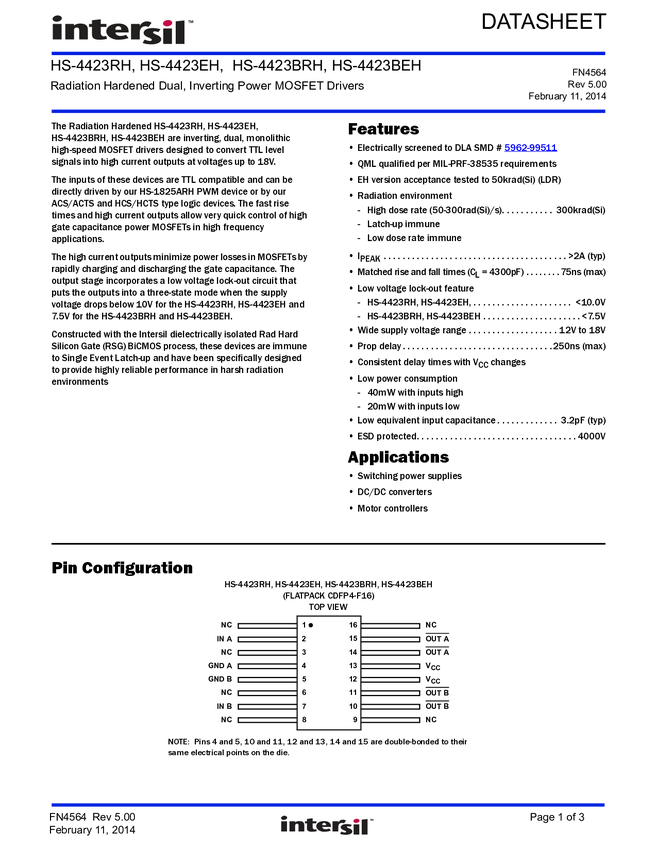 HS-4423RH Radiation Hardened, Dual, Inverting Power MOSFET Driver