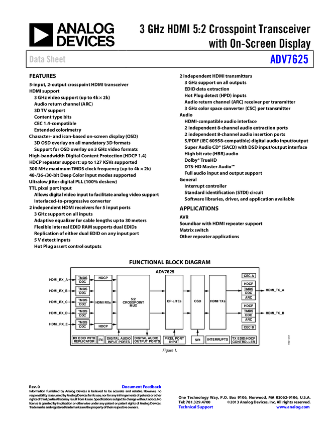 ADV7625 3GH HDMI 5:2 cross point Transceiver with On-Screen Display