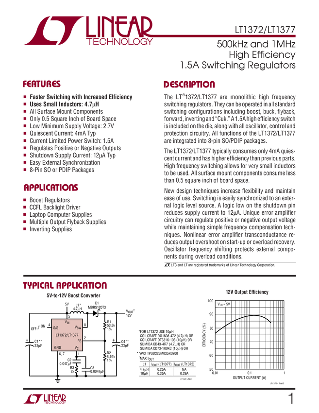 LT1377 500kHz and 1MHz High Efficiency 1.5A Switching Regulators