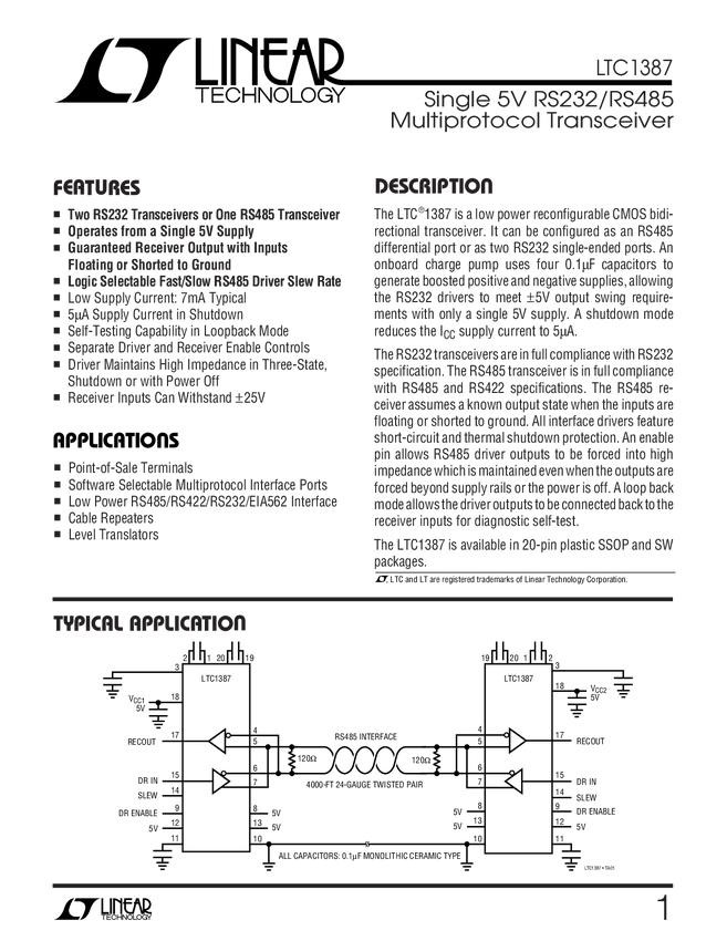 LTC1387 Single 5V RS232/RS485 Multiprotocol Transceiver