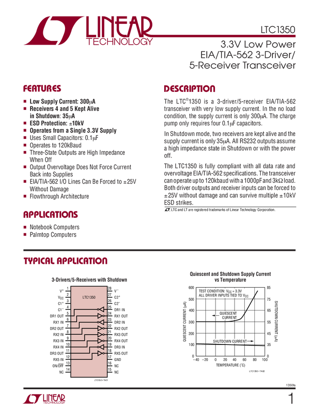 LTC1350 3.3V Low Power EIA/TIA-562 3-Driver/5-Receiver Transceiver