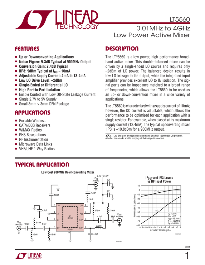 LT5560 0.01MHz to 4GHz Low Power Active Mixer