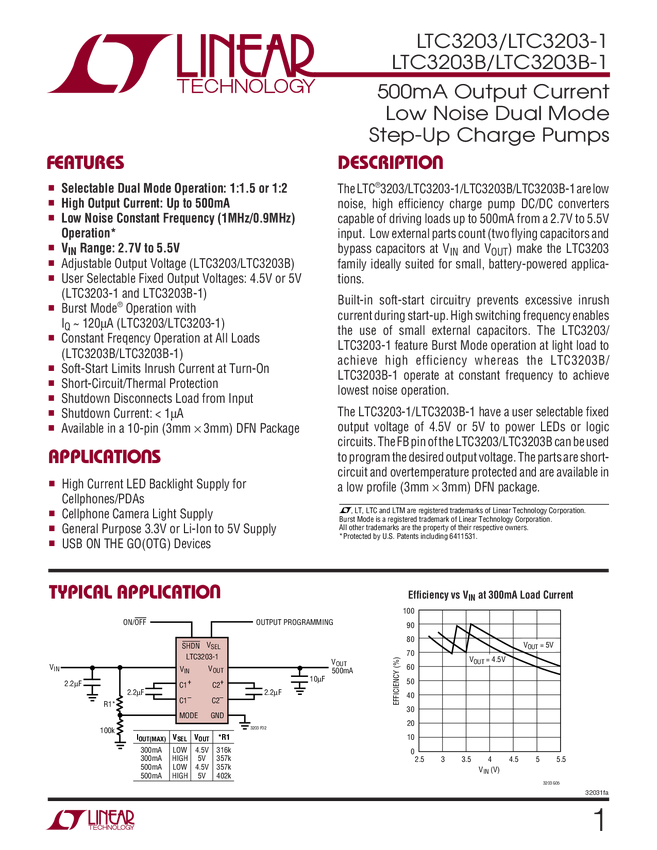 LTC3203 LTC3203-1 LTC3203B LTC3203B-1 500mA Output Current Low Noise Dual Mode Step-Up Charge Pumps