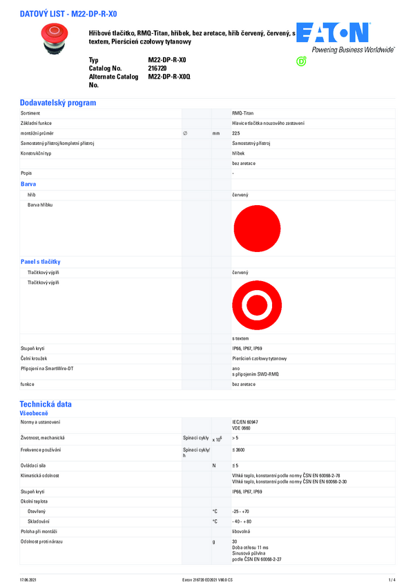 216720 Eaton 216720 M22-DP-R-X0 Przycisk grzybkowy czerwony 1 szt.