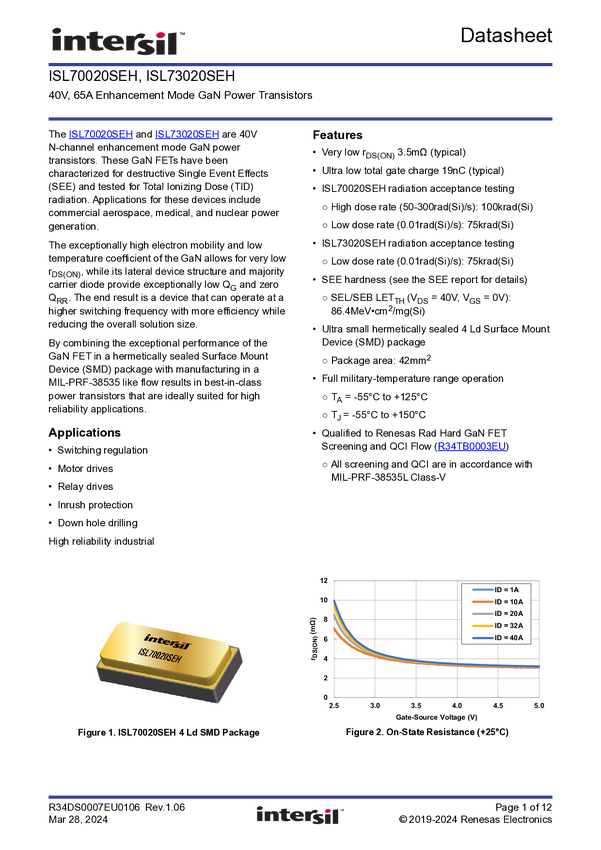 ISL73020SEH 40V, 65A Enhancement Mode GaN Power Transistor
