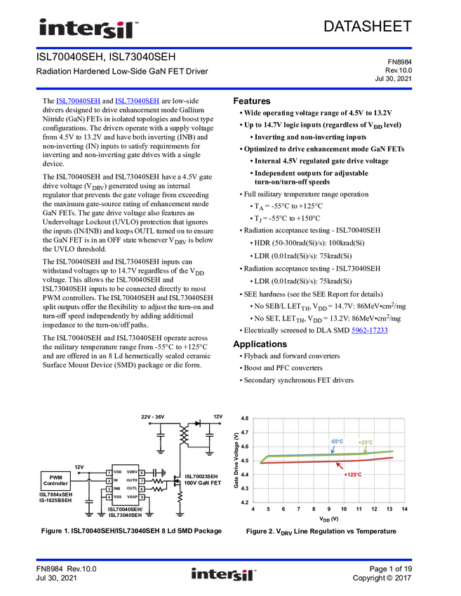 ISL70040SEH Radiation Hardened Low Side GaN FET Driver