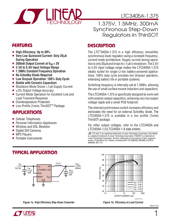 LTC3405A-1.375 1.375V, 1.5MHz, 300mA Synchronous Step-Down Regulators in ThinSOT