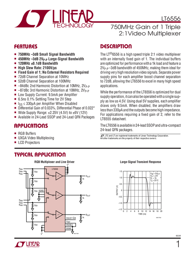 LT6556 750MHz Gain of 1 Triple 2:1Video Multiplexer