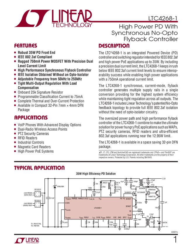 LTC4268-1 High Power PD with Synchronous No-Opto Flyback Controller