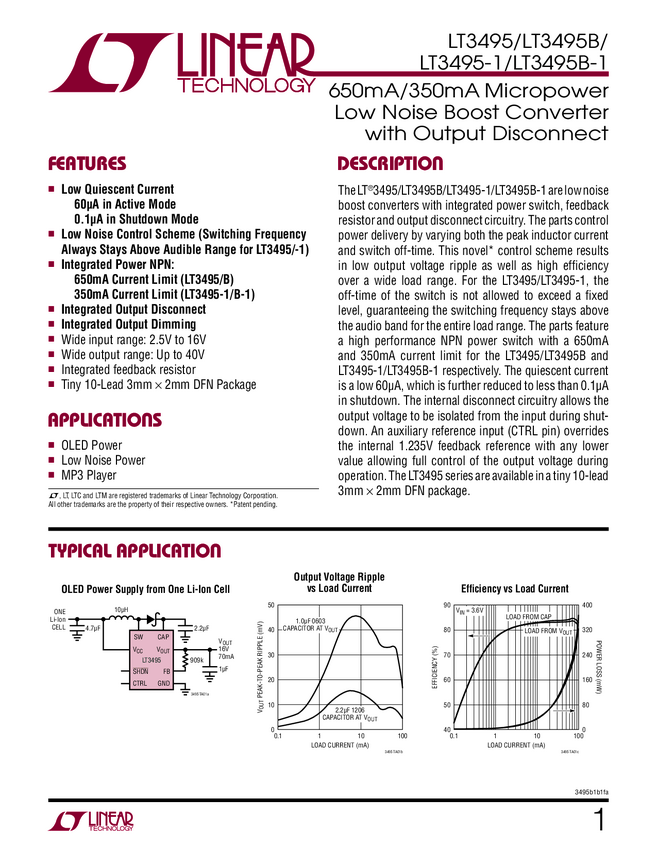 LT3495 650mA Micropower Low Noise Boost Converter with Output Disconnect