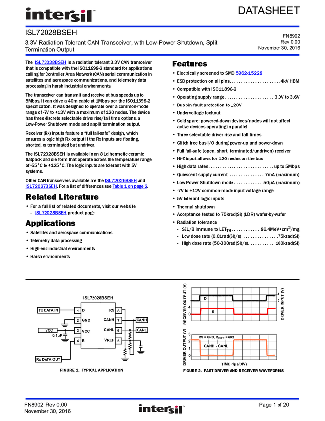 3.3V Radiation Tolerant CAN Transceiver, with Low-power Shutdown, Split Termination Output
