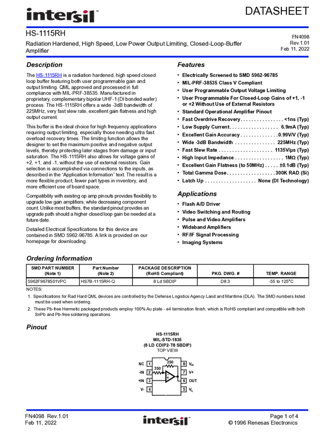 HS-1115RH High Speed, Low Power Output Limiting, Closed-Loop-Buffer Amplifier