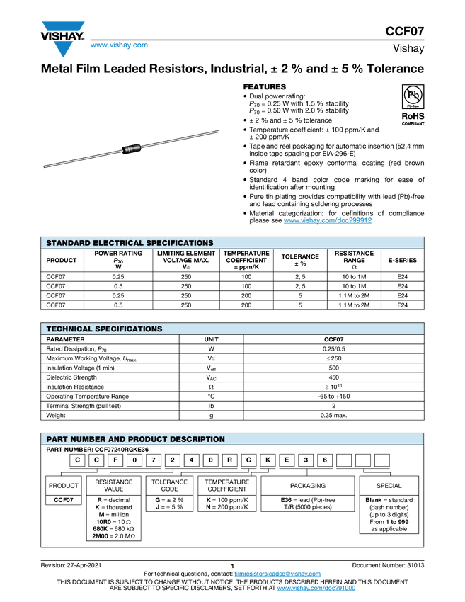 CCF07 Metal Film Leaded Resistors, Industrial, ± 2 % and ± 5 % Toleranc...