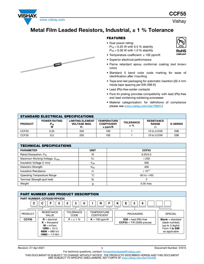 CCF55 Metal Film Leaded Resistors, Industrial, ± 1 % Tolerance