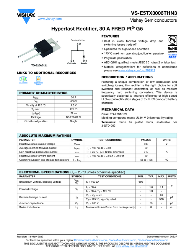 VS-E5TX3006THN3 Hyperfast Rectifier, 30 A FRED Pt® G5