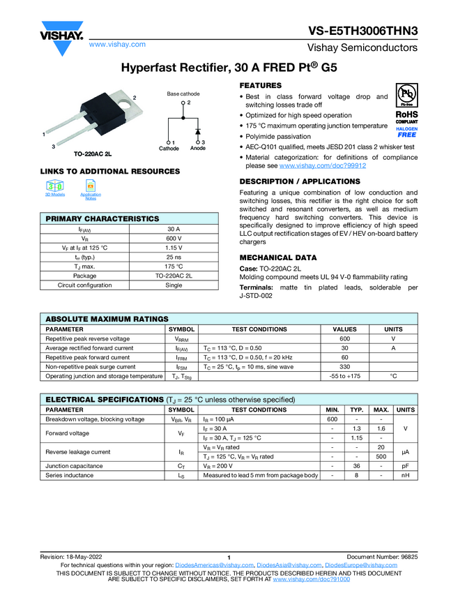 VS-E5TH3006THN3 Hyperfast Rectifier, 30 A FRED Pt® G5