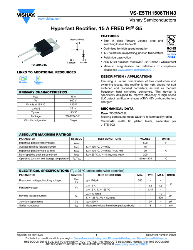 VS-E5TH1506THN3 Hyperfast Rectifier, 15 A FRED Pt® G5