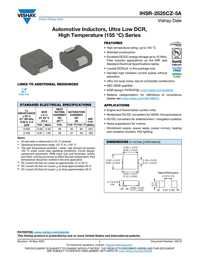 IHSR-2525CZ-5A Automotive Inductors, Ultra Low DCR, High Temperature (155 °C) Series