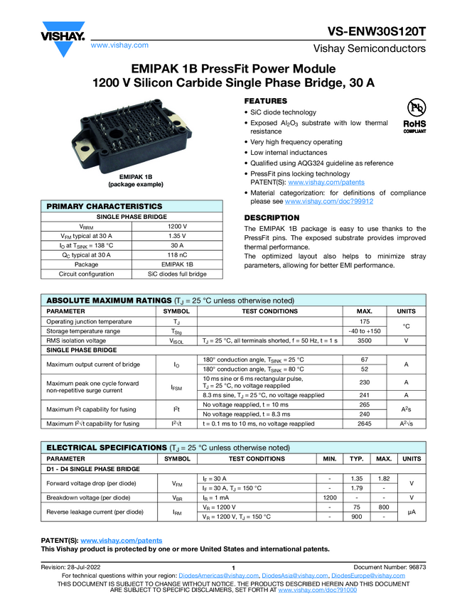 VS-ENW30S120T EMIPAK 1B PressFit Power Module, 1200 V Silicon Carbide Single Phase Bridge...