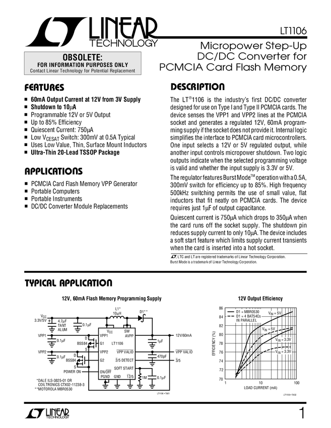 LT1106 Micropower Step-Up DC/DC Converter for PCMCIA Card Flash Memory