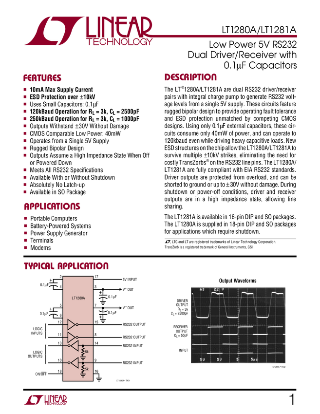 LT1280A Low Power 5V RS232 Dual Driver/Receiver with 0.1µF Capacitors