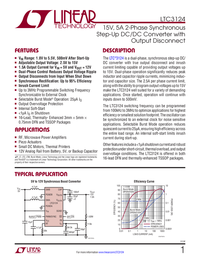 LTC3124 15V, 5A 2-Phase Synchronous Step-Up DC/DC Converter with Output Disconnect