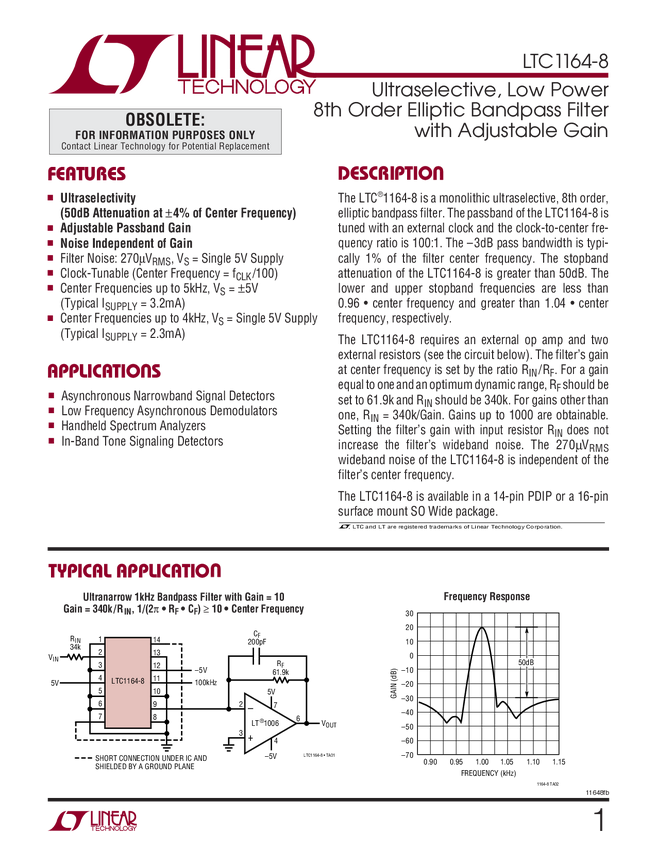 LTC1164-8 Ultraselective, Low Power 8th Order Elliptic Bandpass Filter with Adjustabl...