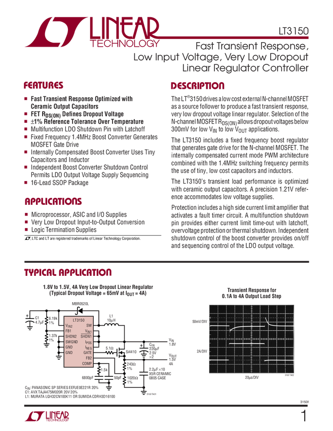 LT3150 Fast Transient Response, Low Input Voltage, Very Low Dropout Linear Regulat...