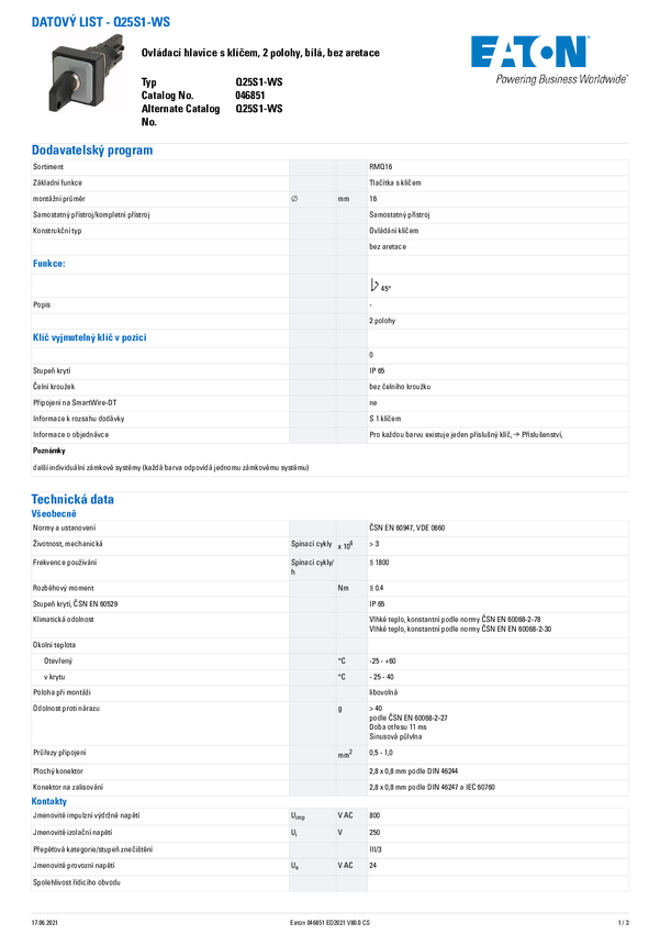 046851 Eaton 046851 Q25S1-WS Przycisk kluczykowy pierścień przedni z tworzywa sztu...