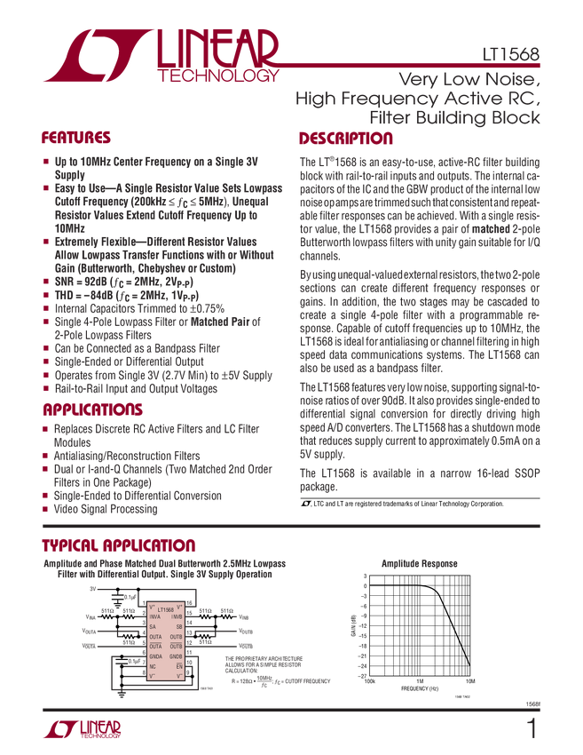 LT1568 Very Low Noise, High Frequency Active RC, Filter Building Block