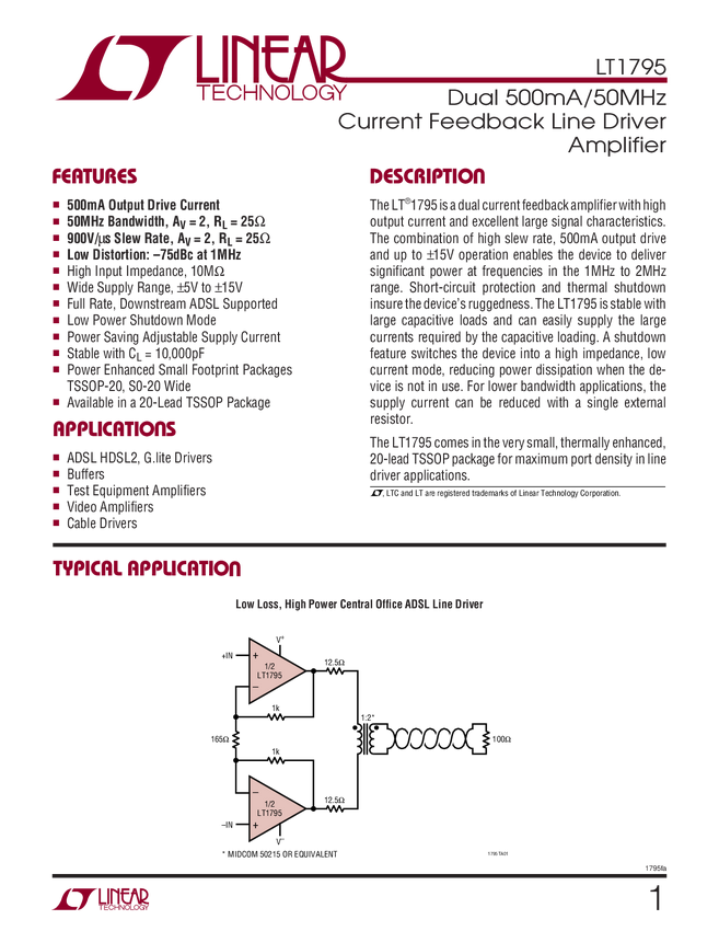 LT1795 Dual 500mA/50MHz Current Feedback Line Driver Amplifier