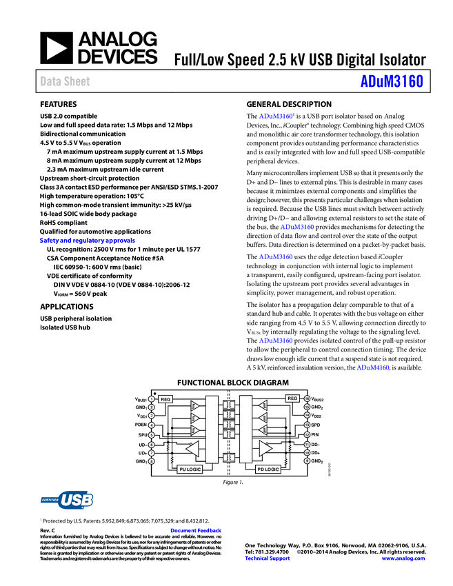 ADUM3160 Full/Low Speed USB Digital Isolator