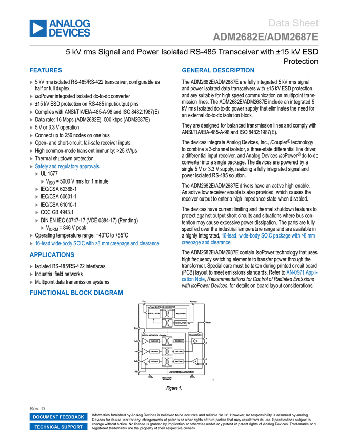 ADM2687E 500 , 5 kV Signal & Power Isolated RS-485 Transceiver with ±15 V ESD Prote...