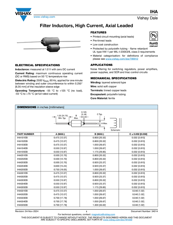 IHA Filter Inductors, High Current, Axial Leaded