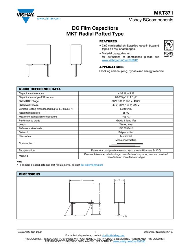 MKT371 DC Film Capacitors MKT Radial Potted Type
