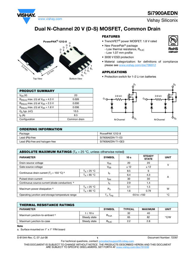 Si7900AEDN Dual N-Channel 20 V (D-S) MOSFET, Common Drain