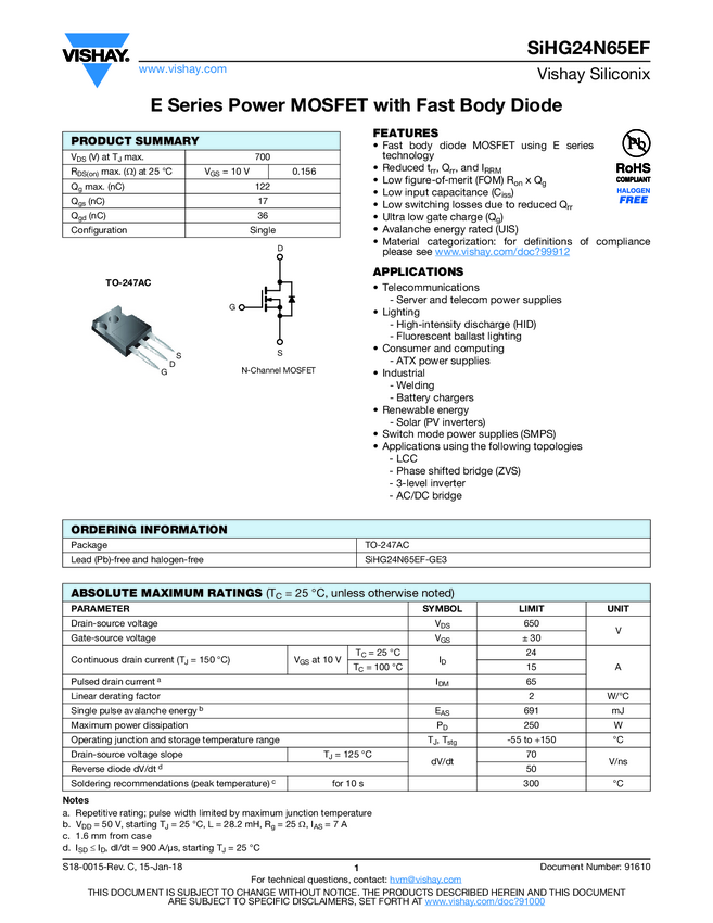 SiHG24N65EF E Series Power MOSFET with Fast Body Diode