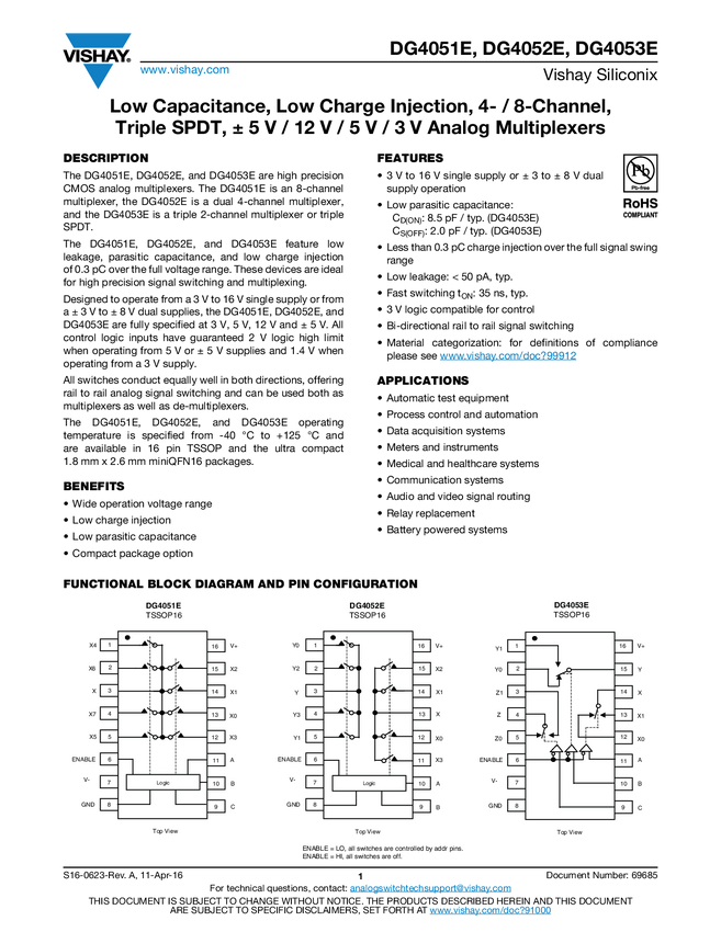DG4051E Low Capacitance, Low Charge Injection, 4- / 8-Channel, Triple SPDT, ±...