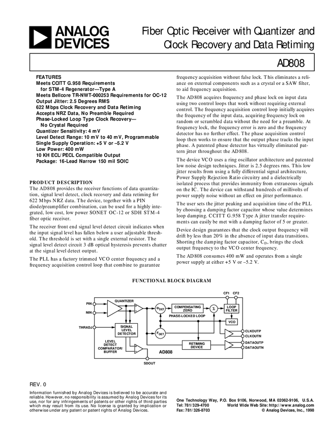AD808 622 Mbps, Low Power, Post-Amp/Clock and Data Recovery IC