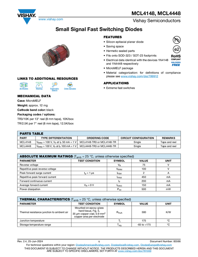 MCL4448 Small Signal Fast Switching Diodes