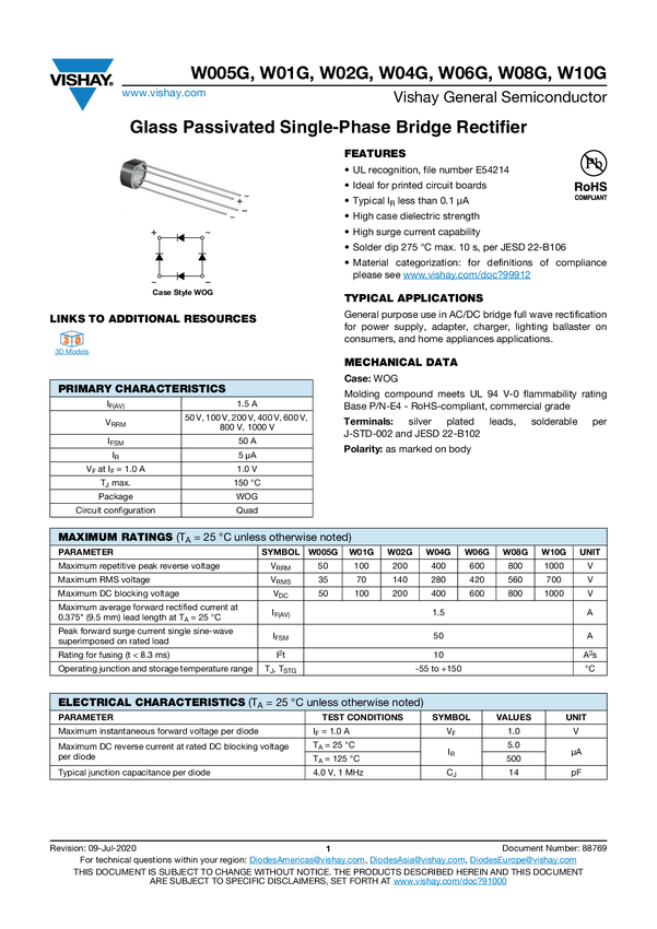 W02G Glass Passivated Single-Phase Bridge Rectifier