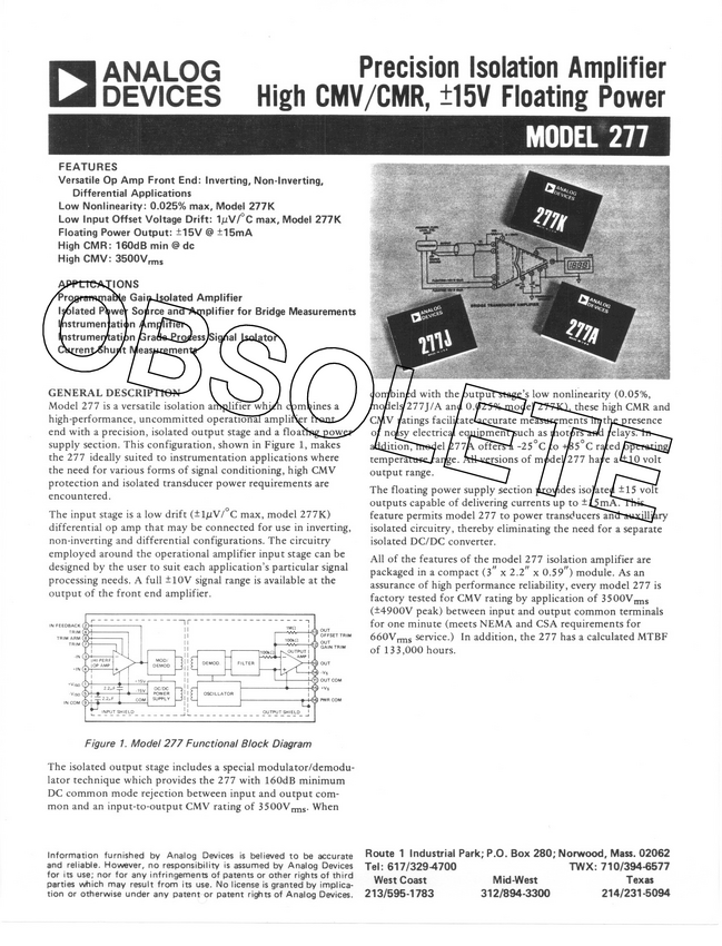 277 Precision Isolation Amplifier HighCMV / CMR, ±15V Floating Power