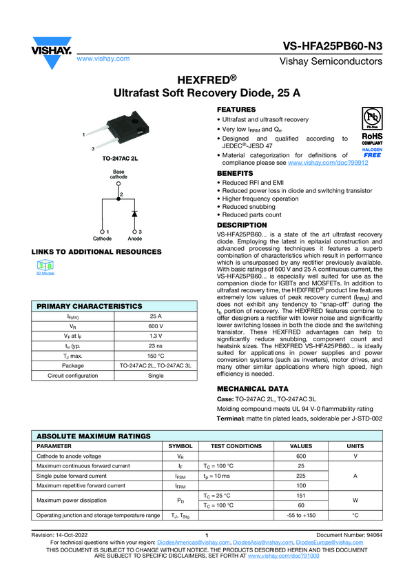 VS-HFA25PB60-N3 HEXFRED® Ultrafast Soft Recovery Diode, 25 A