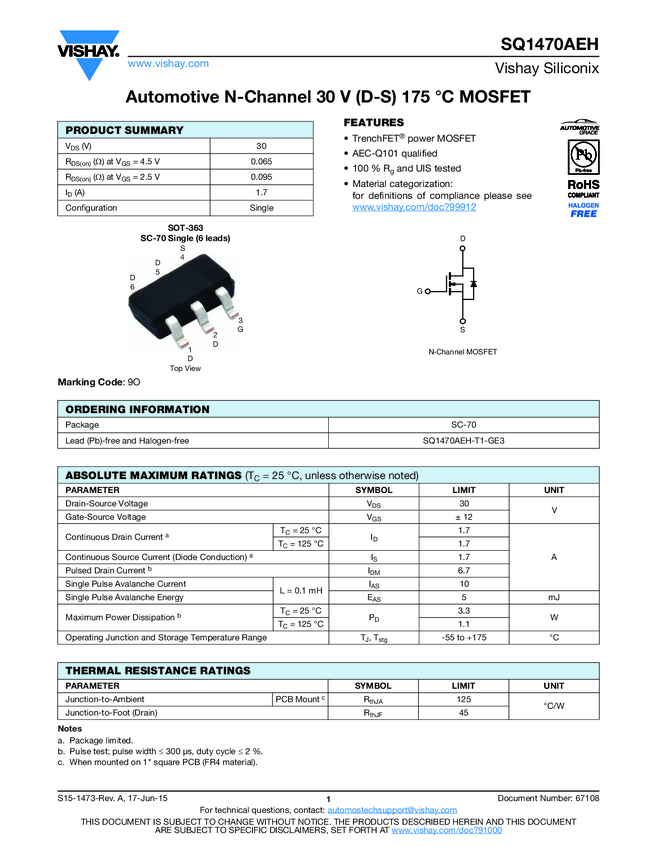 SQ1470AEH Automotive N-Channel 30 V (D-S) 175 °C MOSFET