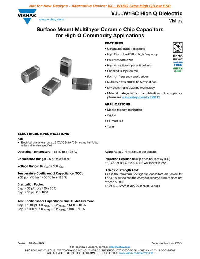 VJ....W1BC High Q Dielectric Surface Mount Multilayer Ceramic Chip Capacitors for High Q Commodity Appli...