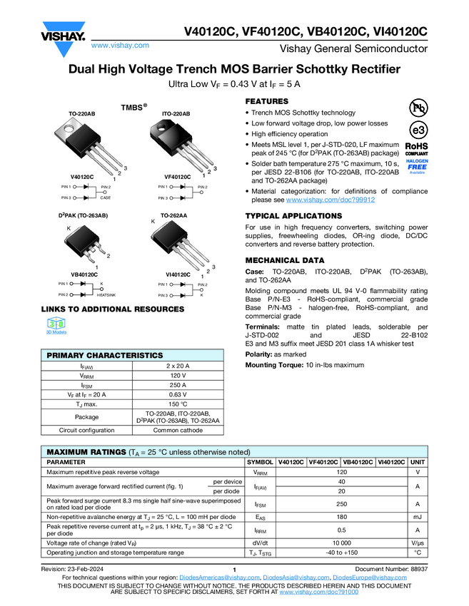 VB40120C Dual High Voltage Trench MOS Barrier Schottky Rectifier