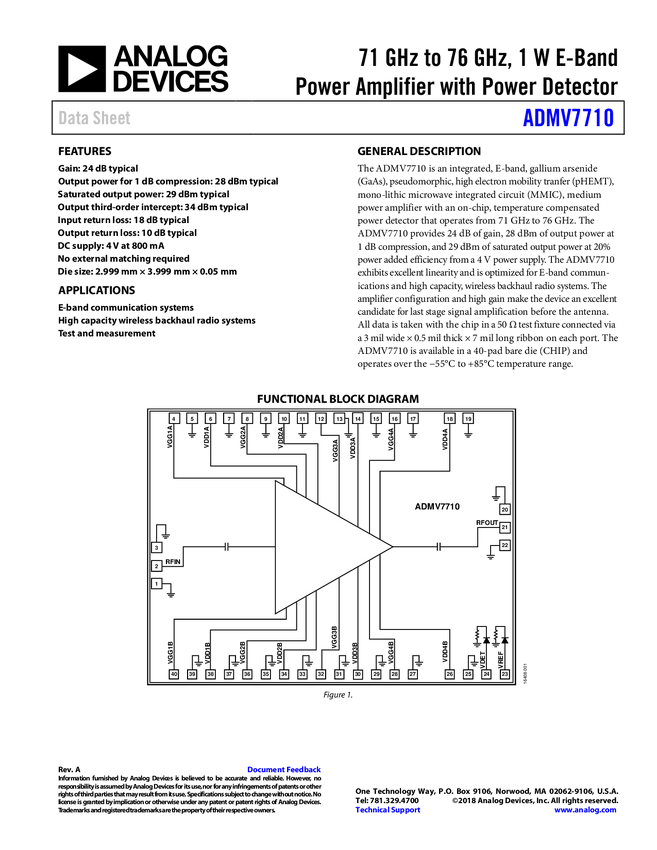 ADMV7710 71 GHz to 76 GHz, 1 Watt E-Band Power Amplifier With Power Detector